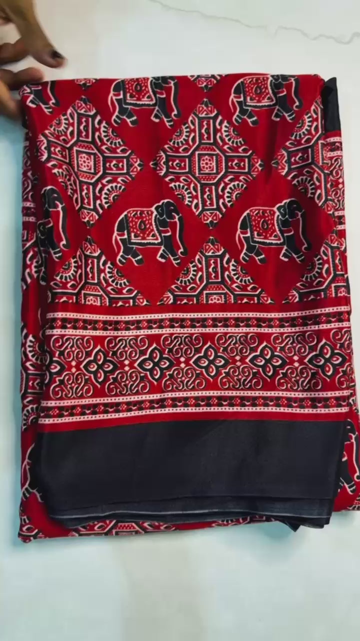 saree weight 480 gram                                                                                 This elegant saree features a traditional Ajrakh-inspired design in striking black and red tones. The fabric is adorned with intricate geometric and elephant motifs, giving it a classic yet vibrant look. Crafted from soft Silk, it ensures comfort and style for both casual and festive occasions. The saree is paired with a matching printed blouse piece, completing its ethnic charm.                                             This elegant saree features a traditional Ajrakh-inspired design in striking black and red tones. The fabric is adorned with intricate geometric and elephant motifs, giving it a classic yet vibrant look. Crafted from soft cotton, it ensures comfort and style for both casual and festive occasions. The saree is paired with a matching printed blouse piece, completing its ethnic charm. ****