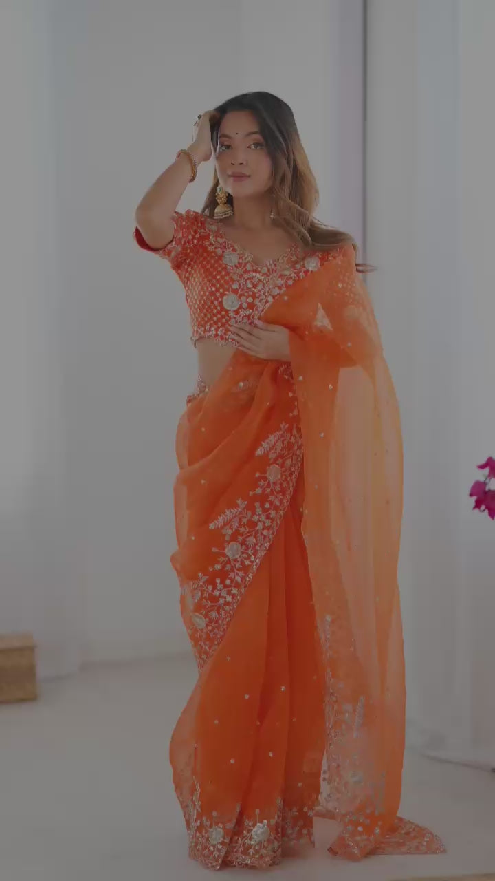 Festive Weeding Wear Orange Organza Saree with Silver Motifs