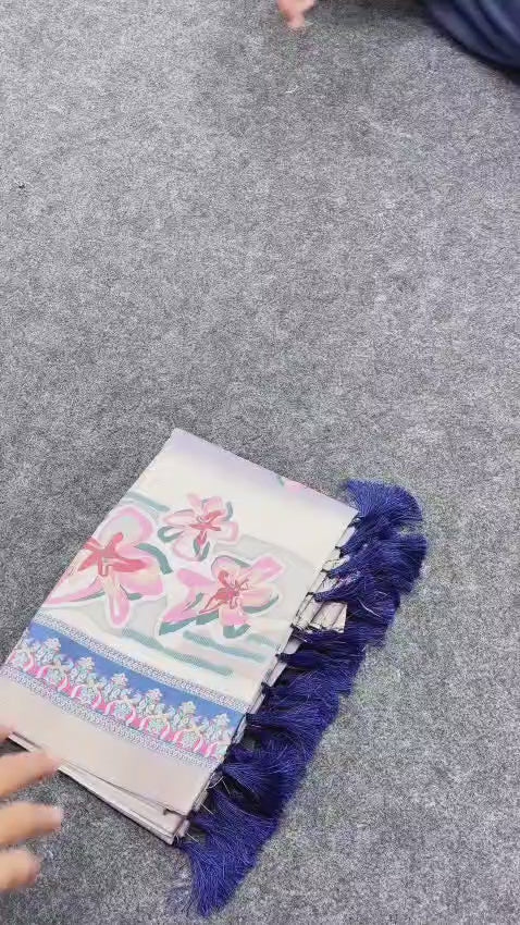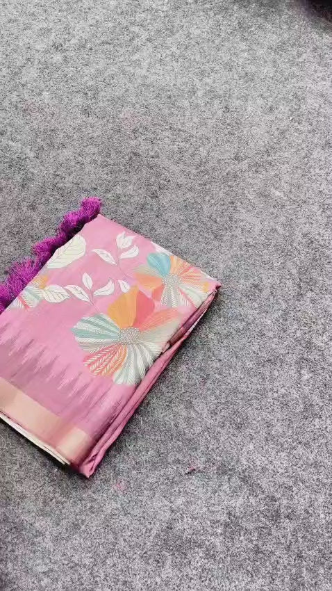Original Silk Sarees with floral prints all over, crafted with 3 inch zari woven border and unique digital printed pallu with tassels