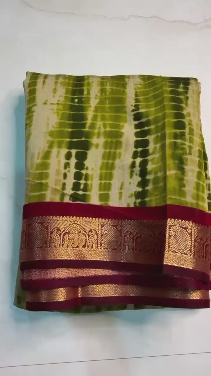 This elegant saree features a beautiful combination of traditional and artistic design. The body of the saree showcases a tie-dye pattern in shades of cream and purple, giving it a vibrant yet graceful appearance. The border is detailed with rich golden zari work on a deep green base, adding a regal touch. The pallu is adorned with a unique village-themed print depicting a camel cart and rural scenery, enhancing its ethnic charm. The saree comes with a contrasting green blouse piece featuring intricate woven motifs, perfectly complementing the overall look.